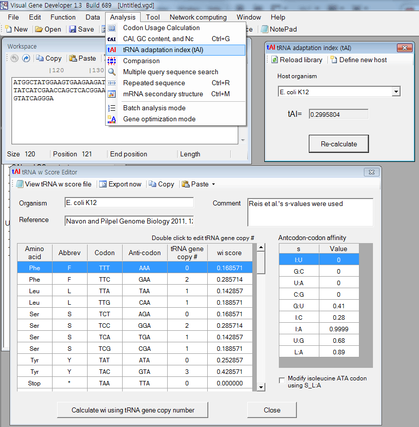 tAI (tRNA adaptation index) calculation 1. Paste any sequence to the 'Workspace' window 2. Click on 'tRNA adaptation index (tAI) in the menu 3. You can see the result in the 'tRNA adaptation index (tAI) window