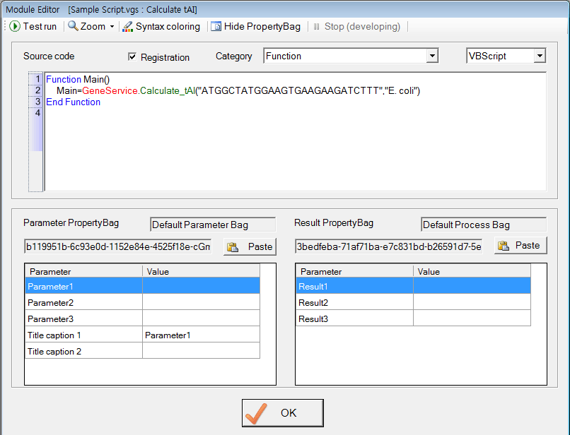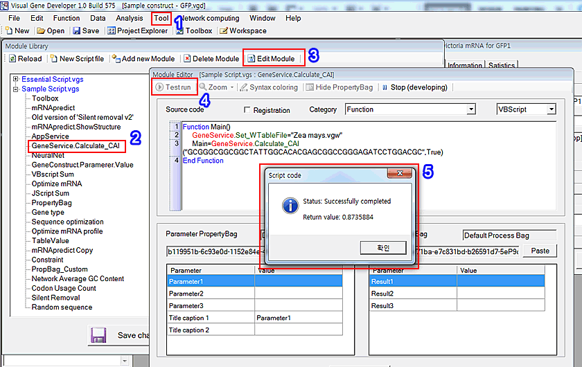 Here is a sample we show. 1. Click on the 'Module library' in the 'Tool' menu 2. The 'Module Library' window will be shown. Choose 'GeneService_Calculate_CAI' 3. Click on the 'Edit Module' button