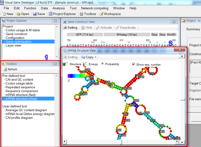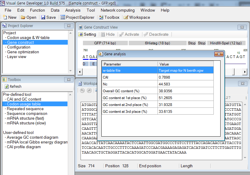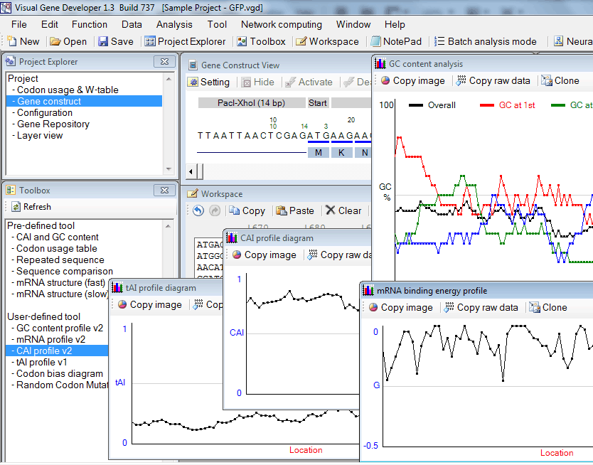 Profiling functions: CAI, mRNA binding energy, tAI, and GC content 1. First of all, paste test sequence to a text box in the 'Workspace' window 2. Click on 'GC content profile v2', 'mRNA profile v2', 'tAI profile v1', or 'CAI profile v2' in the 'Toolbox' window