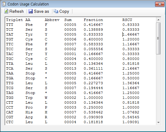 Codon Usage Calculation 1. First, paste sequence to the 'Workspace' window 2. Click on the 'Codon Usage Table' function. 3. You can see the result in the 'Codon Usage Calculation' window