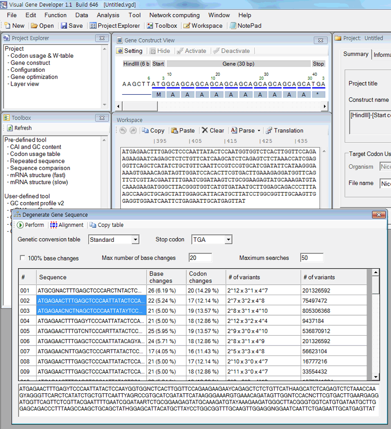 Degenerate sequence 1. First input sequence to the textbox in the 'Workspace' window. 2. Click on the 'Degenerate gene sequence' in the 'Function' menu. 3. Click on the 'Perform' button in the 'Degenerate Gene Sequence' window.