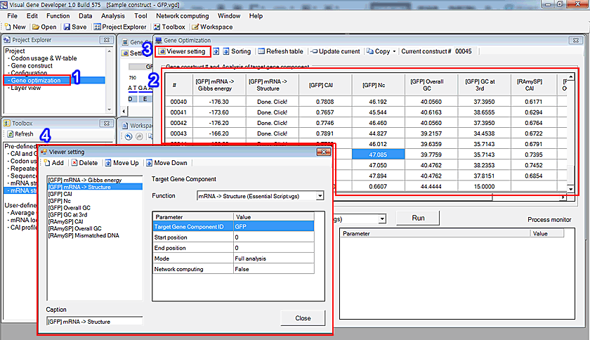 1. Click on the 'Gene optimization' in the 'Project Explorer' window 2. You can see the table in the 'Gene optimization' window 3. Click on the 'Viewer setting' button 4. Click on the 'Add' button in the 'Viewer setting' window to add new functions. The added items will be immediately shown in the table (see number 2)
