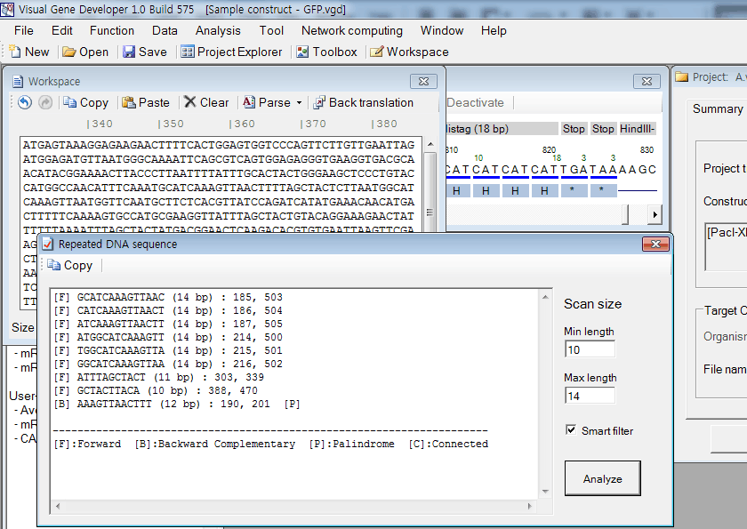 Repeated sequence search 1. First input sequence to the textbox in the 'Workspace' window. 2. Click on the 'Repeated sequence' in the 'Analysis' menu. The result will be shown in the 'Repeated DNA sequence' window. 3. You can click on the 'Analyze' button in the 'Repeated DNA sequence' window instead of clicking the function in the main menu.