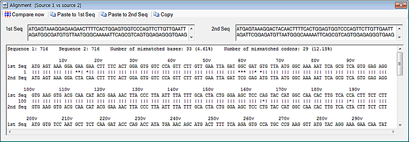 Sequence comparison 1. Click on the 'Sequence comparison' in the 'Analysis' menu. 2. You can also click on the 'Paste to 1st Seq' or 'Paste to 2nd Seq' button to paste sequence therefrom the clipboard 3. Click on the 'Compare now' button. You can see the result.