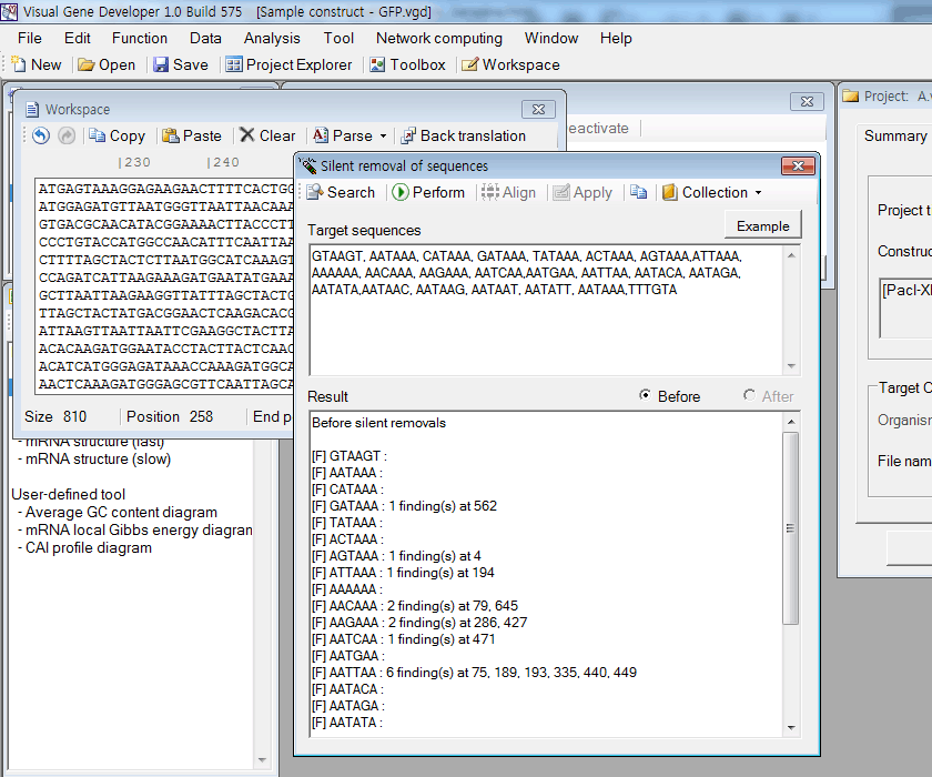 3. Put target sequences in the 'Target sequences' box. Each sequence can be separated by comma (,), Tab, or carriage return key (Enter key) 4. Firstly, click on the 'Search' button. You can see search result in the 'Result' box. 5. Secondly, click on the 'Perform' button. You can see the search result after silent removals in the 'Result' box 6. Thirdly, click on the 'Apply' button to overwrite a source sequence in the 'Workspace' window by a modified sequence 7. Optionally, you can compare the modified sequence with the original sequence. Just click on the 'Align' button.